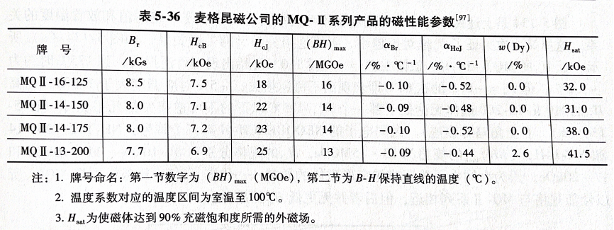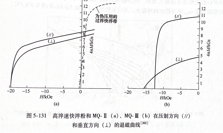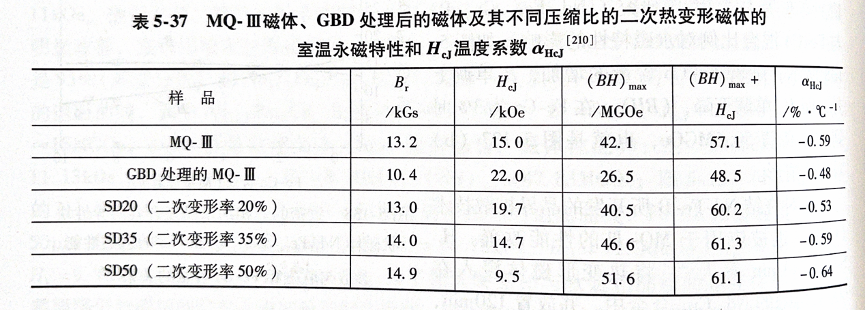 由于热压和热变形温度不算高,作用时间也不长,快淬NdFeB磁粉的细晶粒(纳米或亚微米)结构基本得以保持,因此MQ-Ⅱ和MQ-Ⅲ磁体仍具有很高的HcJ,特别是MQ-Ⅱ的HcJ只比原粉低1~2kOe。之后很长一段时间,GM公司都在生产MQ-Ⅱ和MQ-Ⅲ磁体,直到21世纪初,他们将快淬钕铁硼磁粉的生产转到天津,MQ-Ⅱ和MQ-Ⅲ磁体生产线移到墨西哥后不久即停产。